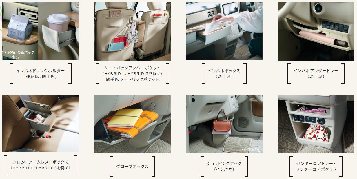 収納スペースは、欲しいところに欲しいポケットがある絶妙な配置。引き出し式の小物入れや、ドリンクホルダーの位置など、日常使いに嬉しい工夫が多く見られます。
