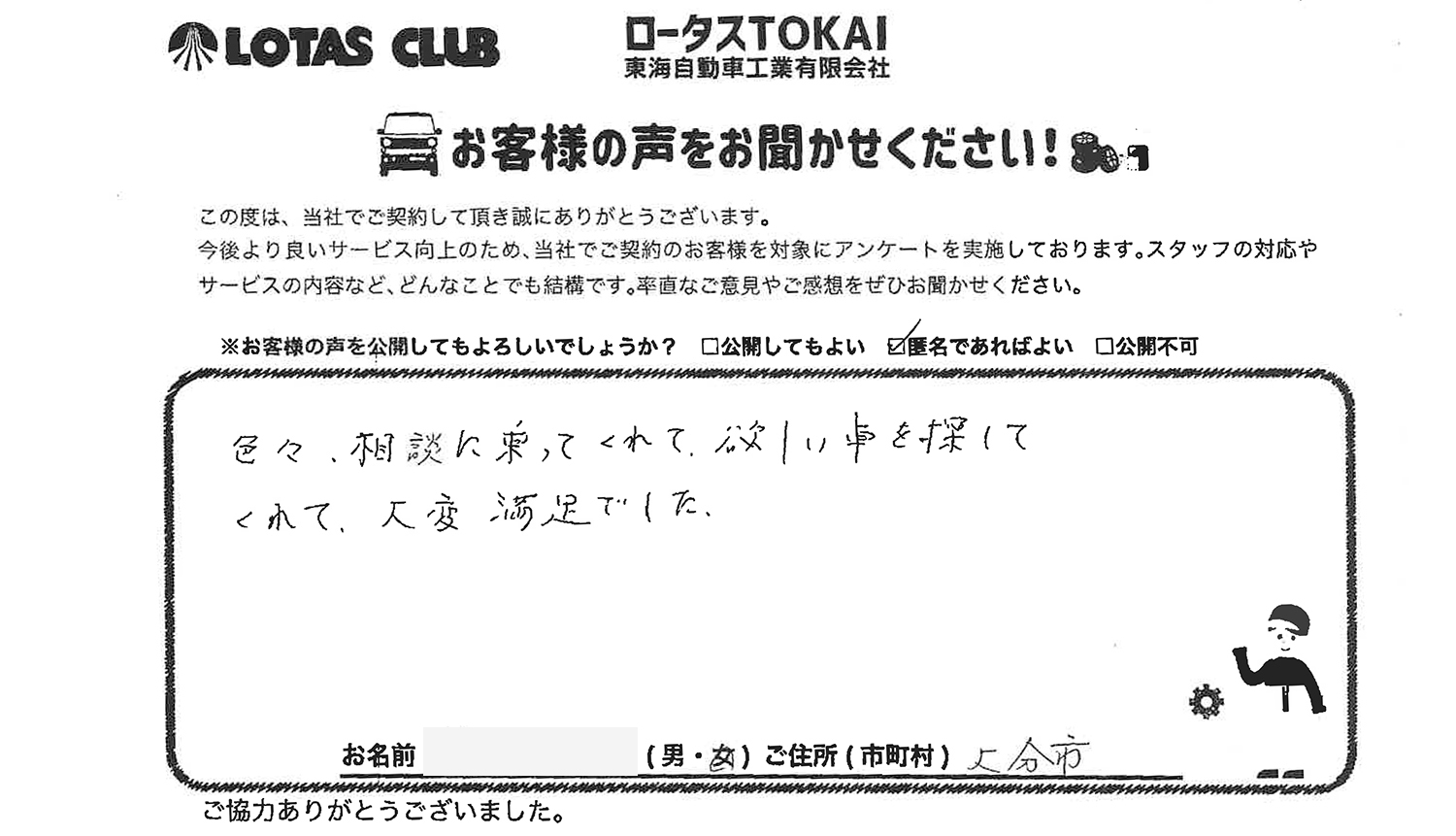 この度は東海自動車工業の新車リースをご利用いただき、誠にありがとうございました。