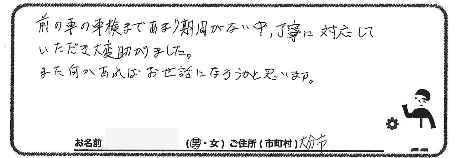 前の車の車検まであまり期間がない中、丁寧に対応していただき大変助かりました。