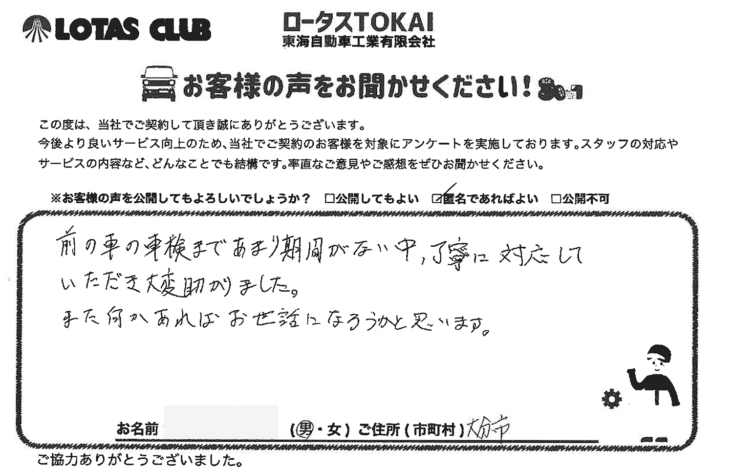 この度は東海自動車工業の新車リースをご利用いただき、誠にありがとうございました。